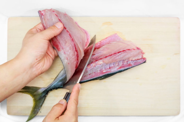 全体にいえる基礎的なコツとは、魚をおろすまな板は必ず濡らしておき、水分を拭き取っておくということです。